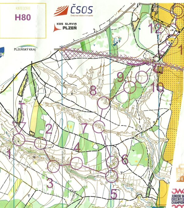 E3 Klasická trať Dobříč. Shromaždiště na dvou sousedících fotbalových hřištích, oddělených strmou strání a velmi složitě opáskované. Například šipka WC ukazovala pouze azimut, kde se TOITOI nacházely. Ve skutečnosti nás pořadatelé několikrát vrátili, nasměrovali napříč doběhovým koridorem, oklikou za cíl a ze strmé stráně na místo. Doběh juniorů bylo možno přejít a fandit z obou stran. V terénu byly stovky údolí a údolíček s bočními údolíčky, vodotečemi a rozvětveními. Občas jáma. Nikolas tentokrát zvítězil, Honzové byli opět 1. a 3. Tentokrát v opačném pořadí.