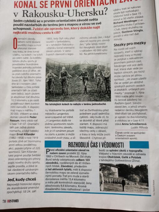 Je zajímavé, že první civilní orientační závod byl cyklistický. Proběhl 24. září 1893 u Rakousko-Uherského města Langenlois (severozápadně od Vídně), což bylo o 4 roky dříve než první civilní závod v orientačním běhu (31. říjen 1897 údolí Sorkedalen u Osla). Více viz. článek z History v příloze.
