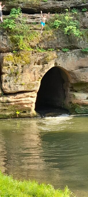 Fotka je z vycházky k působivé “Průrvě Ploučnice”. Kluci to bosky prošli tam a zpět, je tam po kolena. Ale voda padá do velmi hlubokého jezírka. Jak je patrno z přiloženého obrázku, domorodci, pro pobavení publika, do jezírka z portálu průrvy skáčou.
