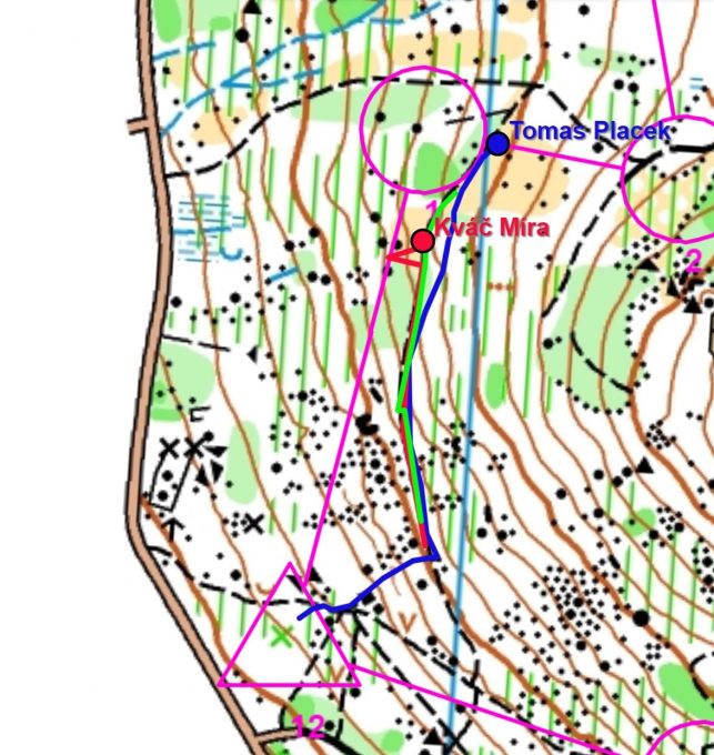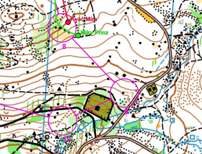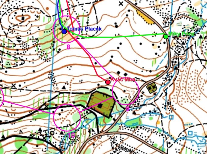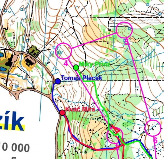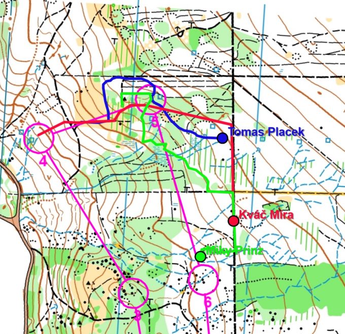 Miky se rozhodl pro běh po vrstevnici až na silnici a tudy na jistotu ke kontrole. Toho využil Míra a za stejný čas, kdy je Miky na silnici, se dostává přímým azimutovým postupem ke kontrole a ujímá se průběžného vedení. Tomas sice ztrácí, ale rychlým azimutem náskok soupeřů zkracuje.