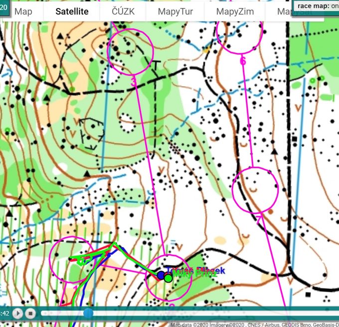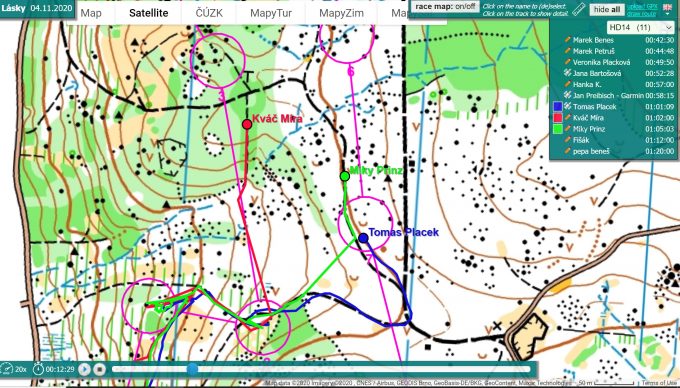 V aplikaci play-map je zřejmé, že Tomasovy postupy jsou nahrané z hodinek, Miky s Mírou si postupy zakreslili ručně (a proto se může zdát, že běží celý závod rovnoměrně bez zastavení … na rozdíl od Tomase, ale není tomu tak).