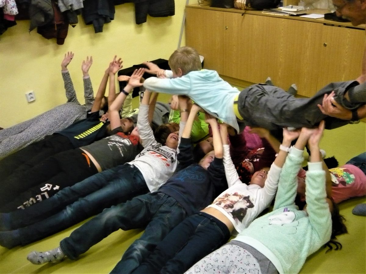 Anděl nebyl potřeba. U stropu se vznášel čert, jak je patrno z přiloženého obrázku. Oba přítomní Mikulášové jsou vidět kousek pod ním. Brzy po tomto fotografování si všichni mohli při několika zkouškách vzájemné důvěry ověřit, že velcí i malí MLOKci se na sebe mohou navzájem bezvýhradně spolehnout. Přesto, že některé discipliny působily dost ošemetně, nedošlo ani k náznaku porušení spolupráce a všechno dobře dopadlo. I když klubko soutěžících se občas nějakou chvíli nedařilo rozplést. Došlo i na kulturu.